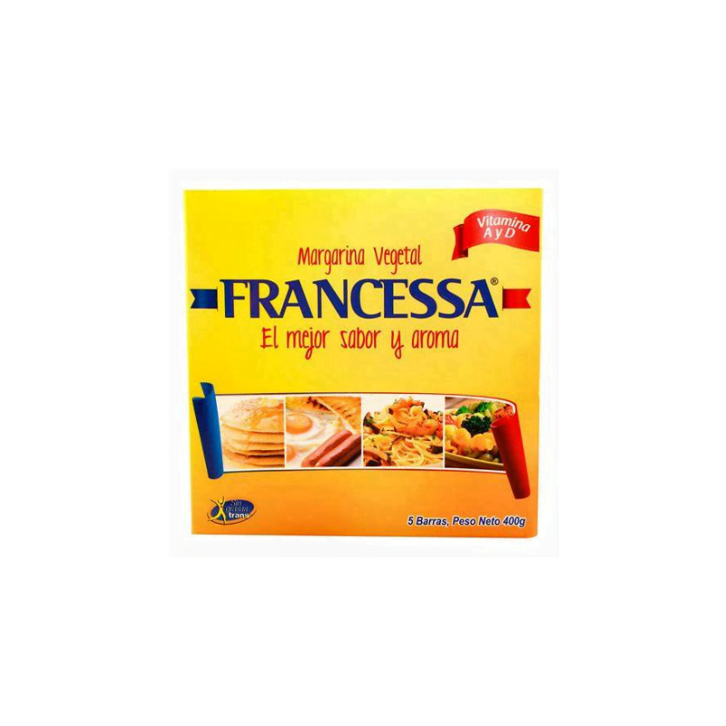 La Margarina Francessa es una margarina de origen 100% vegetal. Está enriquecida con vitaminas A&D, que ayudan al desarrollo y fortalecimiento de huesos, dientes y piel. Además, tiene un sabor a leche y mantequilla.